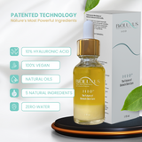 BioLuxus's game-changing innovation: Our exclusive microparticle technology transforms hyaluronic acid into a form that seamlessly blends with premium facial oils. The result? An unprecedented concentration of this moisture-binding powerhouse that activates directly on your skin.